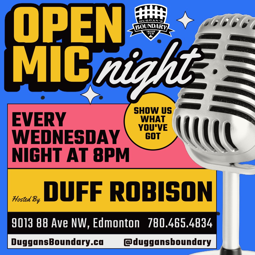 Open Mic Wednesday, January 7, 2026 8:00 p.m. 11:00 p.m. Google Calendar ICS The mic is open and the stage is yours! Every Wednesday at 8 PM, join host Duff Robison for Open Mic Night at Duggan’s Boundary — great tunes, local talent, and good vibes all night long.